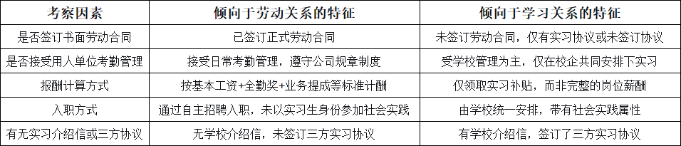 第三,需结合具体事实综合判断。 广东省的司法实践中,劳动争议仲裁机构在判断实习学生与用人单位之间是否构成劳动关系时,会综合考察以下因素: