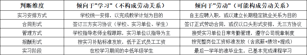 这一原则也得到了司法实践的普遍认可。在相关案例中,法院明确指出:在校学生在用人单位进行实习,应当根据具体事实进行判断,"对完成学校的社会实习安排或自行从事社会实践活动的实习,不认定为劳动关系"。